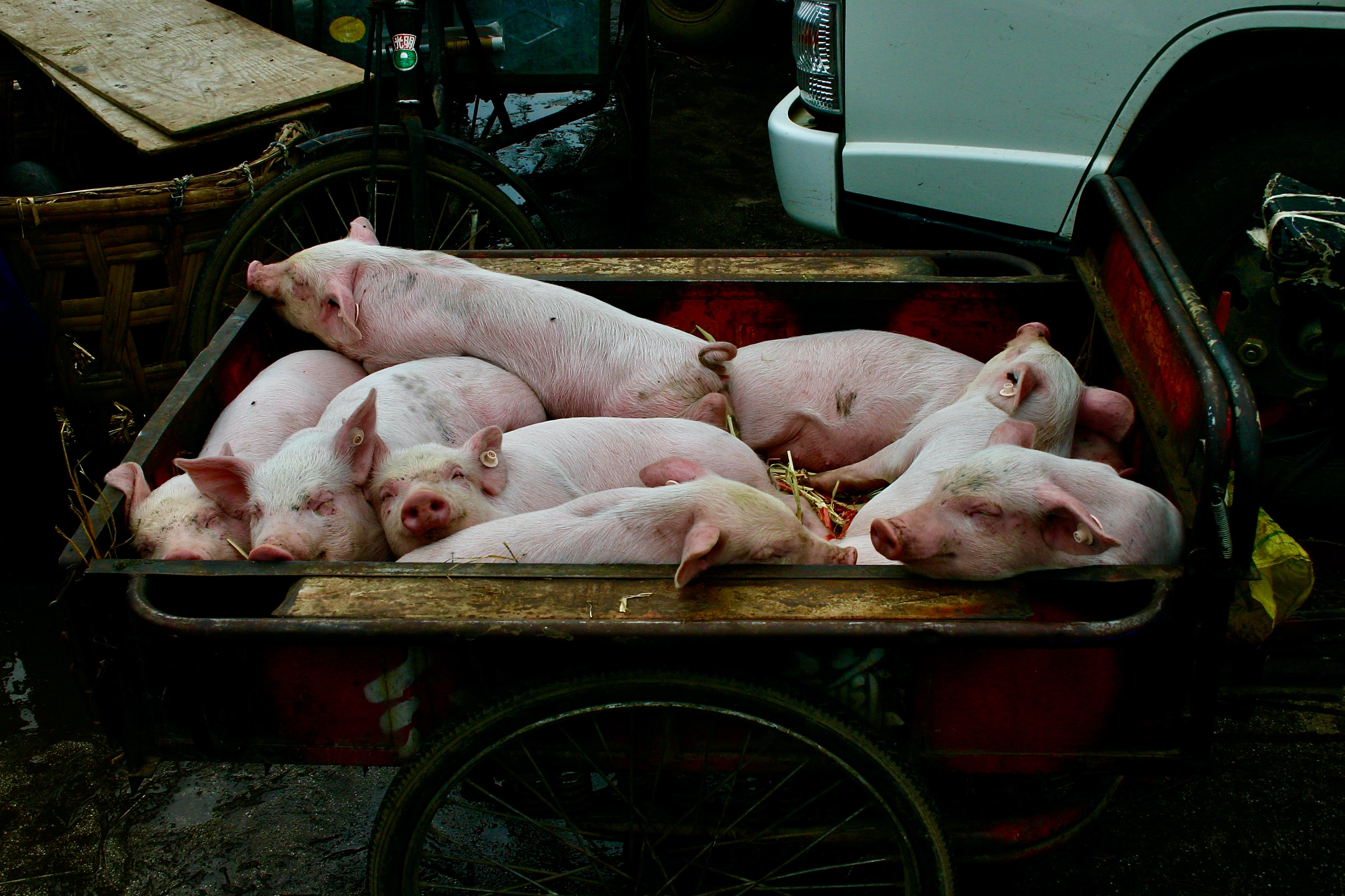 Перевезення свиней на фермі трактором.
